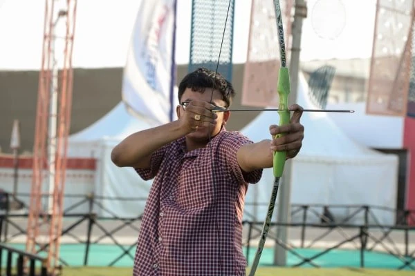 Archery is one of the activities offered at the Rann Utsav accommodation. This is a temporary accommodation setup with luxury tents and various amenities to provide a comfortable stay for visitors. Among the activities available, archery stands out as a popular choice, allowing guests to try their hand at this traditional sport.